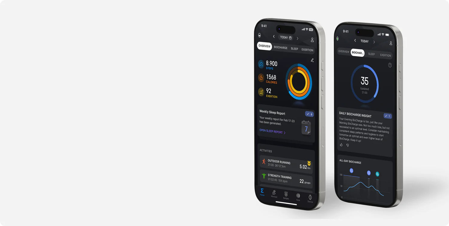 From the moment you wake up after a night of rest, your BioCharge™ score will adapt based on your daily workouts, activities, and stress levels. -